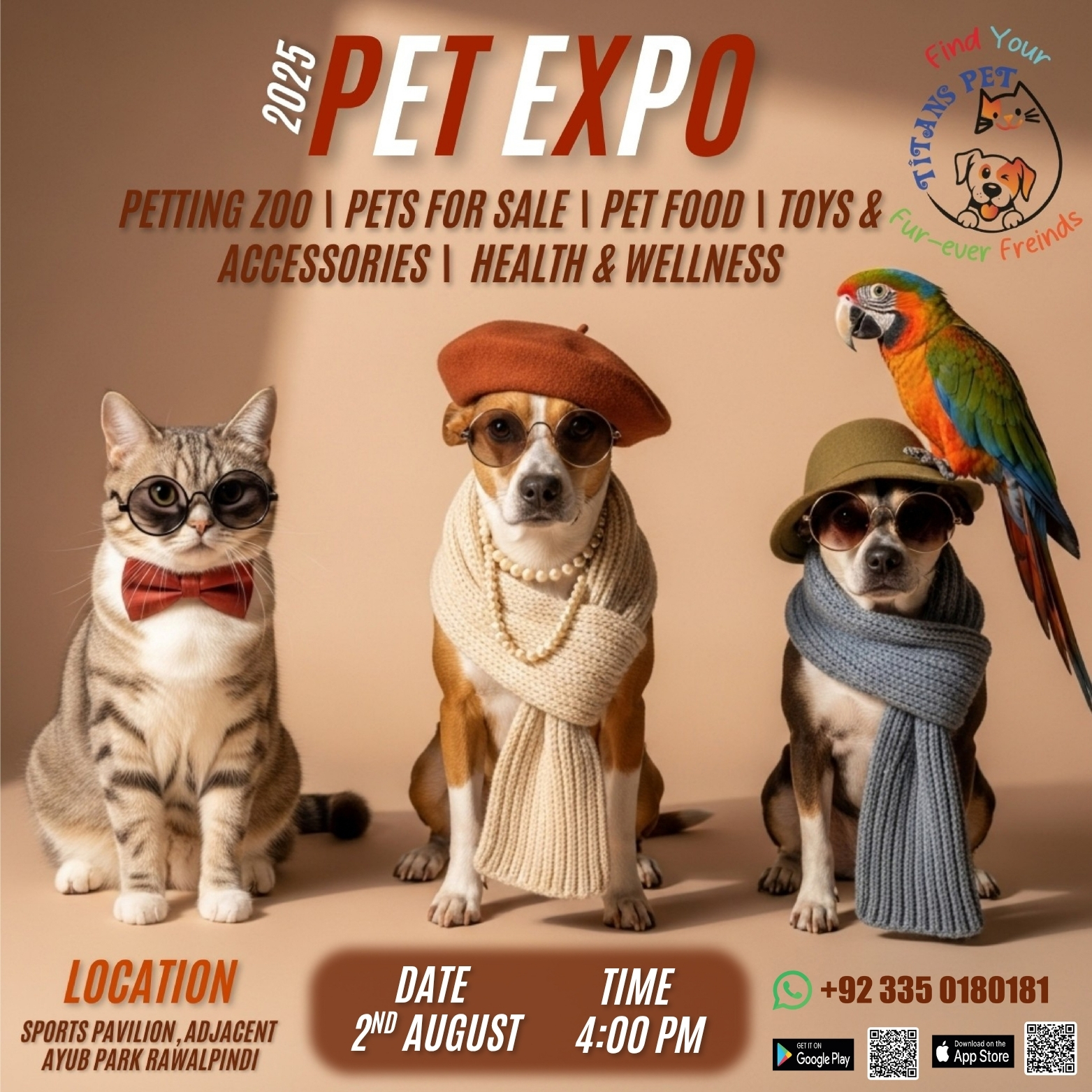 Join us for Pet Expo 2025 at the Rawalpindi Pavilion (adjacent to Ayub Park) on August 2nd, 2025 at 4:00 PM.